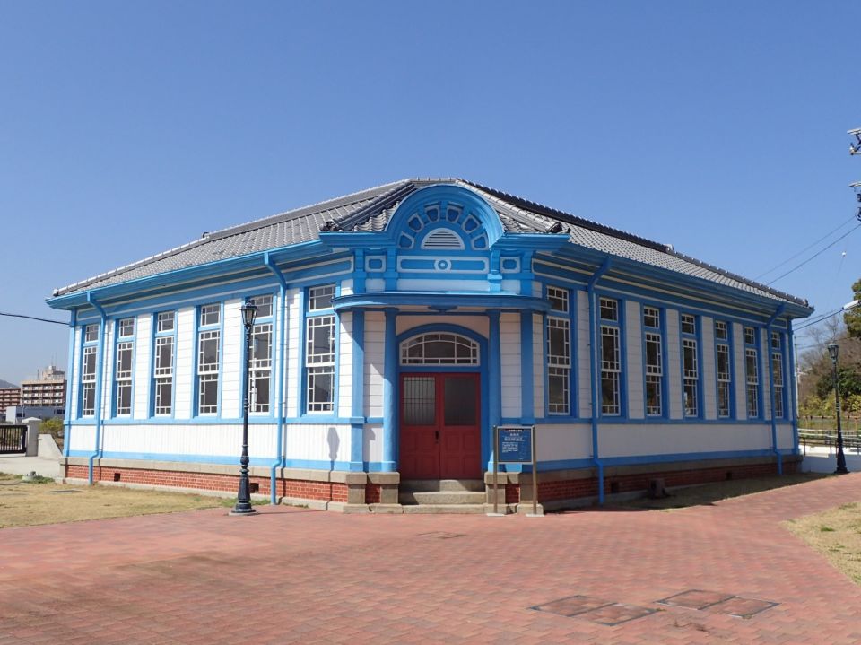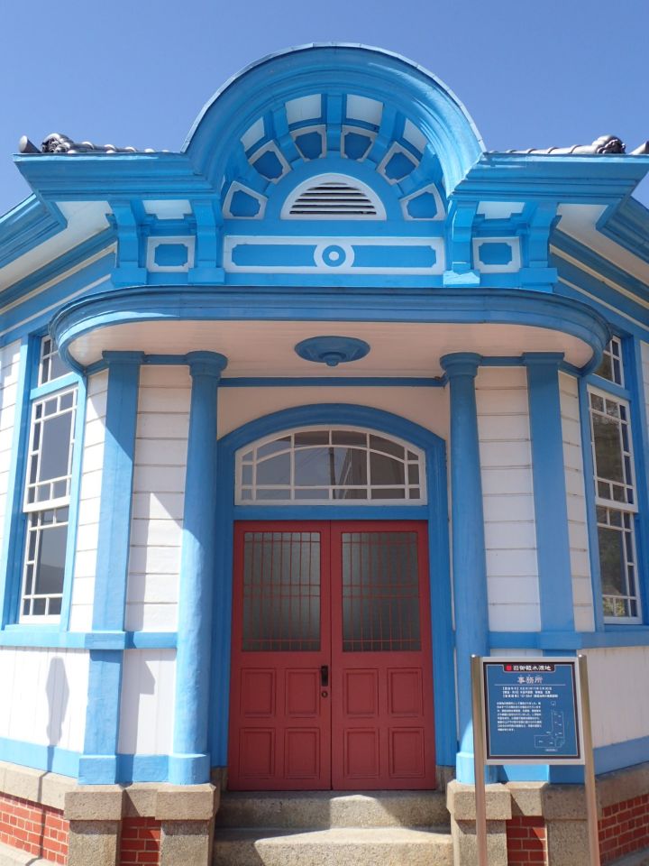 ポンプ場らしからぬ白い下見板張りに青い縁取りの外観が美しい洋風の建物で