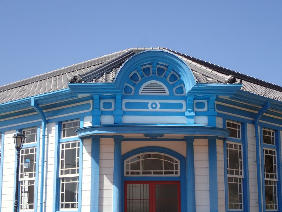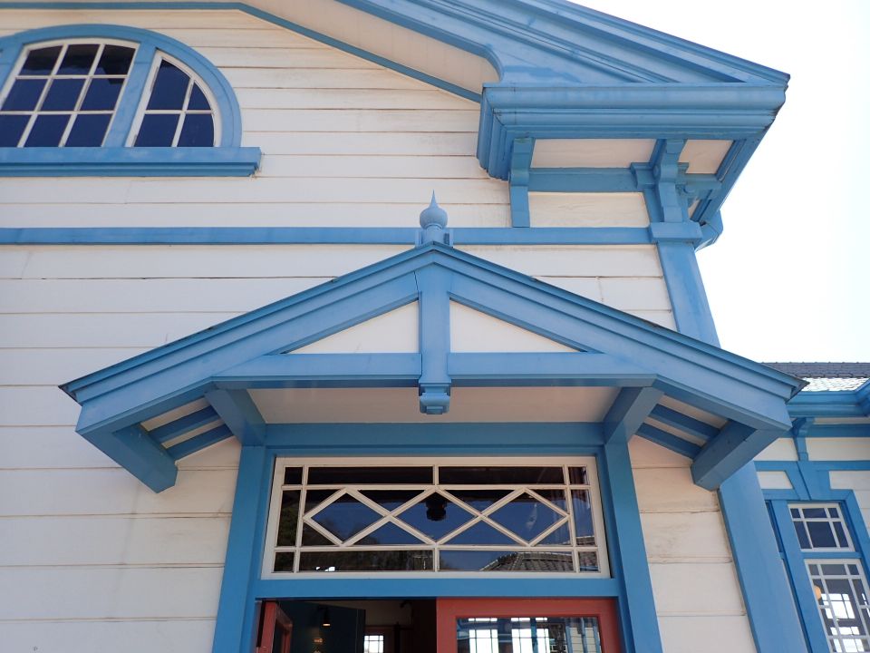 妻面の半円形の窓や屋根上部の円形の飾りなどが華やかさを演出していました。